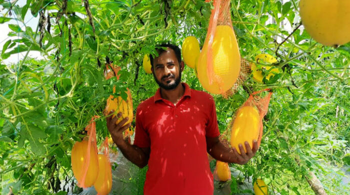 হবিগঞ্জ জেলার বাহুবল উপজেলার বার আউলিয়া গ্রামের কৃষক মো. দুলাল মিয়া বাড়ির পাশে প্রায় ২০ শতক জমিতে মাচা তৈরি করে তরমুজের আবাদ করেছেন। বর্তমানে মাচায় মাচায় শোভা পাচ্ছে হলুদ ও