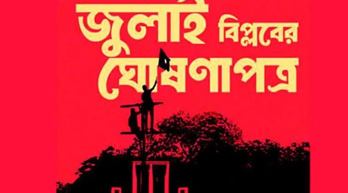 অন্তর্বর্তী সরকারের প্রধান উপদেষ্টা অধ্যাপক মুহাম্মদ ইউনূস মঙ্গলবার (৫ আগস্ট) রাজধানীর মানিক মিয়া অ্যাভিনিউয়ে ‘৩৬ জুলাই উদ্‌যাপন’ শীর্ষক অনুষ্ঠানে জুলাই ঘোষণাপত্র পাঠ করেছেন।   জুলাই ঘোষণাপত্র ১। যেহেতু উপনিবেশ বিরোধী