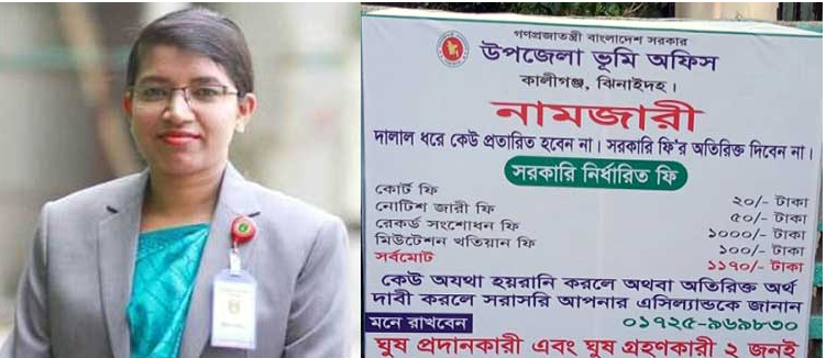 ঝিনাইদহের কালীগঞ্জে ঘুষ ঠেকাতে সাইনবোর্ডে নিজের মোবাইল নম্বর দিয়েছেন উপজেলা সহকারী কমিশনার (ভূমি) ভুপালী সরকার। তার এমর উদ্যোগ সবার নজর কেড়েছে। ভুপালী সরকার জমির নামজারিসহ ভূমি অফিসের যেকোনো কাজের জন্য