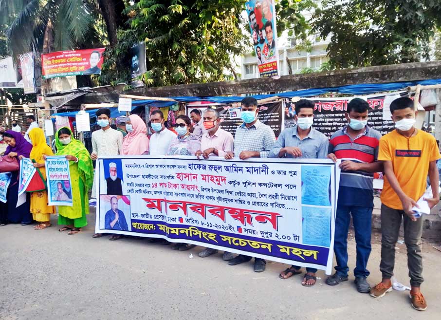 জেলা করেসপন্ডেন্ট: চাকুরি দেয়ার নামে মোটা অঙ্কের টাকা হাতিয়ে নেয়ার অভিযোগ এনে ময়মনসিংহের ত্রিশালের এমপি হাফেজ রুহুল আমিন মাদানী এবং তার পুত্র উপজেলা ছাত্রলীগের সভাপতি হাসান মাহমুদের বিরুদ্ধে মানববন্ধন করেছেন