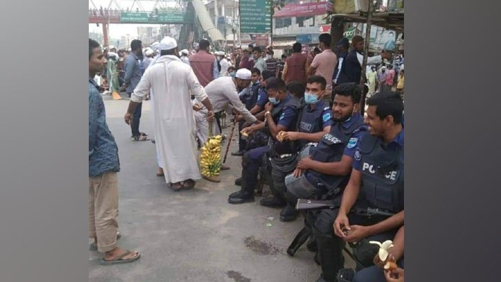 নরসিংদীতে হেফাজতে ইসলামের ডাকা সকাল-সন্ধ্যা হরতাল চলাকালে পুলিশ সদস্যদের কলা খাইয়েছেন হরতালকারী। ছবিটি বিভিন্ন সামাজিক যোগাযোগমাধ্যমে ঘুরছে। ভাইরাল হয়েছে কলা দেয়ার দৃশ্য। একই সঙ্গে বাংলাদেশের পতাকা হাতে নিয়ে ঘোড়ায় চড়ে