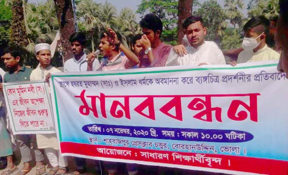 ফ্রান্সে হযরত মুহাম্মদ (সাঃ) ও ইসলাম ধর্মকে অবমাননা করে ব্যঙ্গচিত্র প্রদর্শনীর প্রতিবাদে বোরহানউদ্দিনে সাধারণ শিক্ষার্থীদের আয়োজনে মানববন্ধন অনুষ্ঠিত হয়। শনিবার সকাল ১০টায় বোরহানউদ্দিন শাহবাজপুর প্রেস ক্লাব চত্বরে মানববন্ধন করেন সাধারণ