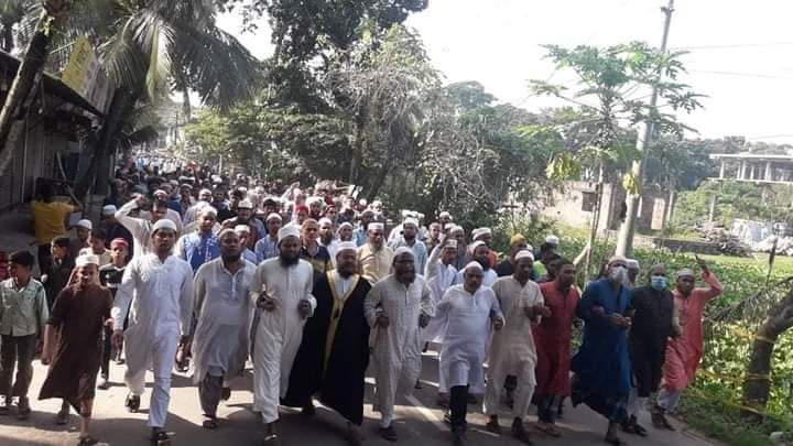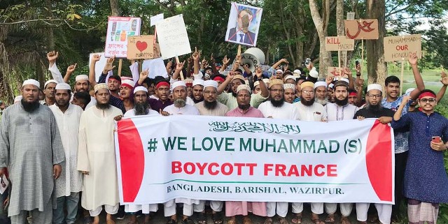 ফ্রান্সে রাষ্ট্রীয় পৃষ্টপোষকতায় হযরত মুহাম্মদ (সাঃ) এর ব্যাঙ্গচিত্র প্রদর্শনকারী বিরুদ্ধে বিক্ষোভ মিছিল ও মানববন্ধন করেছে বরিশাল বাবুগঞ্জ পাঁচরাস্তা মোড় এলাকার ধর্মপ্রাণ মুসলিমরা। শুক্রবার (৩০ই) অক্টোবর জুম্মার নামাজ শেষে একর্মসূচি পালন
