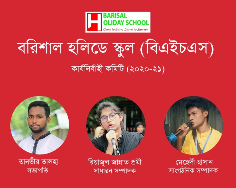 বরিশাল হলিডে স্কুল(বিএইচএস) এর (২০২০ -২১) সেশনের নতুন কার্যনির্বাহী কমিটি অনুমোদন পেলো। বিএইচএস এর সুপ্রীম কাউন্সিল সদস্য মাহফুজুল ইসলাম মানিকের স্বাক্ষরিত বিজ্ঞপ্তিতে, বরিশাল বিশ্ববিদ্যালয়ের শিক্ষার্থী তালহা তানভীরকে সভাপতি, শহীদ সোহরাওয়ার্দী