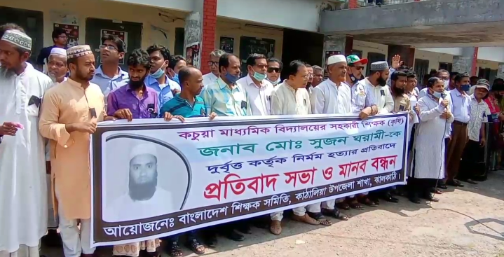 ঝালকাঠি প্রতিনিধিঃ- ঝালকাঠির কাঠালিয়ার কচুয়া মাধ্যমিক বিদ্যালয়ের সহকারি শিক্ষক মোঃ সুজন ঘরামীর হত্যাকারীদের গ্রেফতার ও বিচারের দাবীতে মানববন্ধন ও প্রতিবাদ সমাবেশ অনুষ্ঠিত হয়েছে। আজ মঙ্গলবার (১৫মার্চ) দুপুরে উপজেলা পরিষদের সামনের সড়কে