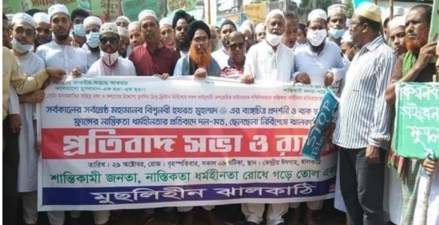 ঝালকাঠি প্রতিনিধি ॥ ফ্রান্সে মহানবী (সা.) এর ব্যঙ্গচিত্র প্রদর্শন করার প্রতিবাদে ঝালকাঠিতে হাজার-হাজার ধর্মপ্রাণ মুসুল্লি বিক্ষোভ মিছিল ও প্রতিবাদ সমাবেশ করেছেন।   বৃহস্পতিবার সকাল ১০টায় ঝালকাঠি ঈদগাঁ মাঠে প্রতিবাদ সমাবেশের